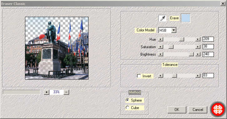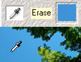 Eraser classic permet d'effacer aisément une couleur donnée. Une utilisation typique consiste à activer la pipette, sélectionner la couleur directement dans la fenêtre de prévisualisation, et de modifier la tolérance jusqu'à ce que le résultat soit satisfaisant.